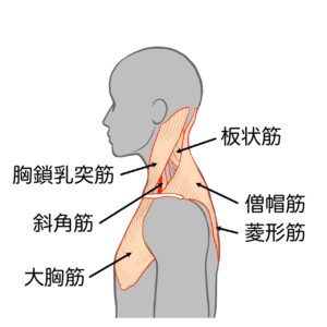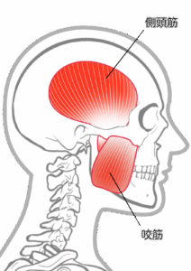 咬筋・側頭筋が緊張することで、その緊張に首肩周りの筋肉が引っ張られ、強い緊張・凝りを感じるようになります。