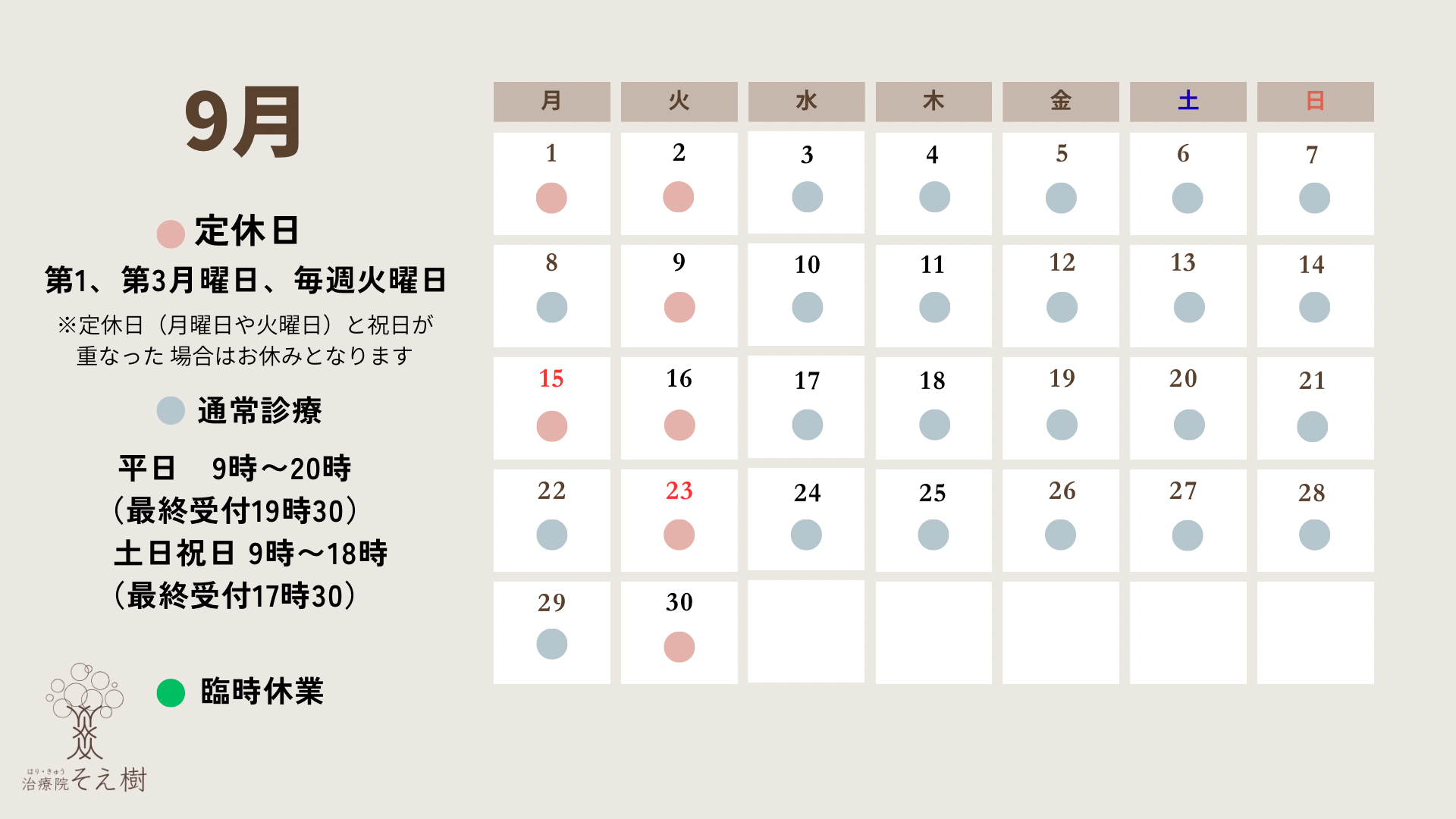 2025.09.07 9月診療案内 9月診療案内 ご覧いただきありがとうございます。 9月の診療案内となります。 勉強会などによる急な変更等がある際は、再度ご案内いたします。 Post Share Hatena Line RSS feedly Pin it note OPENキャンペーン開催中 前の記事 診療予定一部変更のお知らせ 次の記事