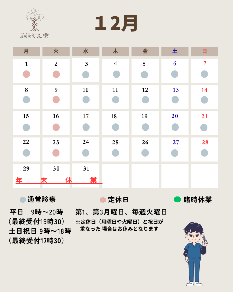 2025.12.04 長野市|はりきゅう治療院|12月診療カレンダーのお知らせ 12月診療カレンダーのお知らせ ご案内の通りとなります。ご確認の上お越しください。 ※12月15日は通常お休みとなりますが、通常通り診療いたします。 ※年内は28日までの診療となります。 Post Share Hatena Line RSS feedly Pin it note 当院駐車場付近工事のため、迂回をお願いいたします。 前の記事