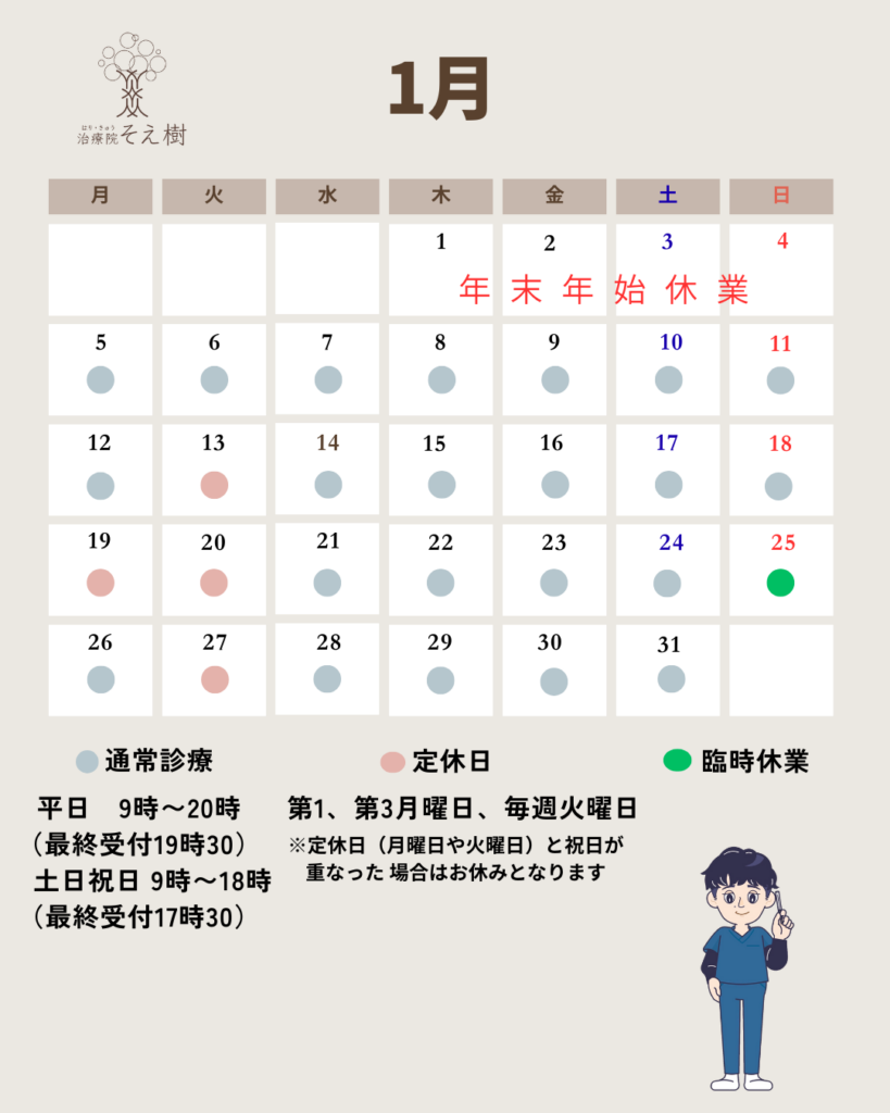 2026.01.07 長野市|整体・はりきゅう|1月の施術受付のご案内 1月の施術受付のご案内 ご覧いただきありがとうございます。 本年もはりきゅう治療院そえ樹をよろしくお願いいたします。 1月の施術受付のご案内となります。ご確認の上お越しください。 ※25日(日)は勉強会参加のためお休みをいただきます。 Post Share Hatena Line RSS feedly Pin it note 長野市初|ダーマローラーによる、肌質改善コースの導入が始まりました 前の記事
