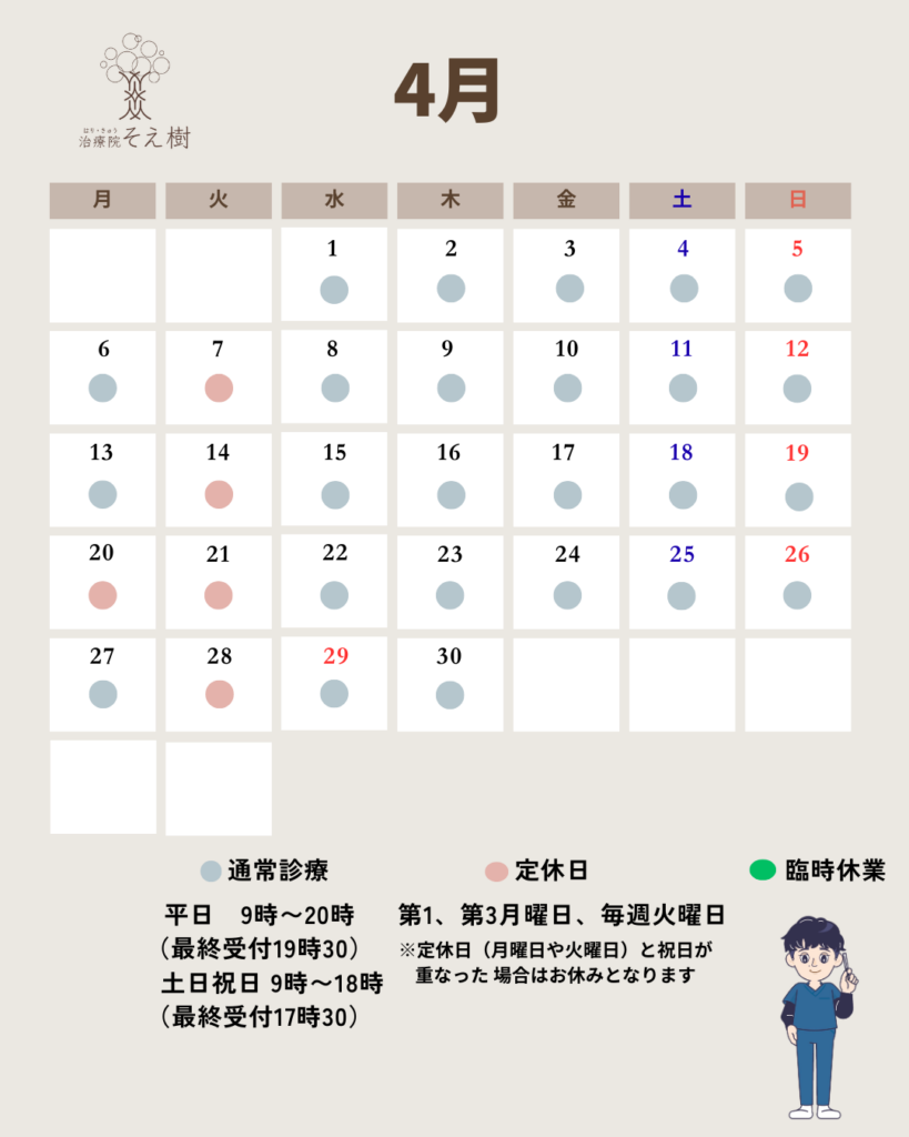また、施術は院長が一人で対応しておりますので、施術中はお電話に出られない場合がございます。